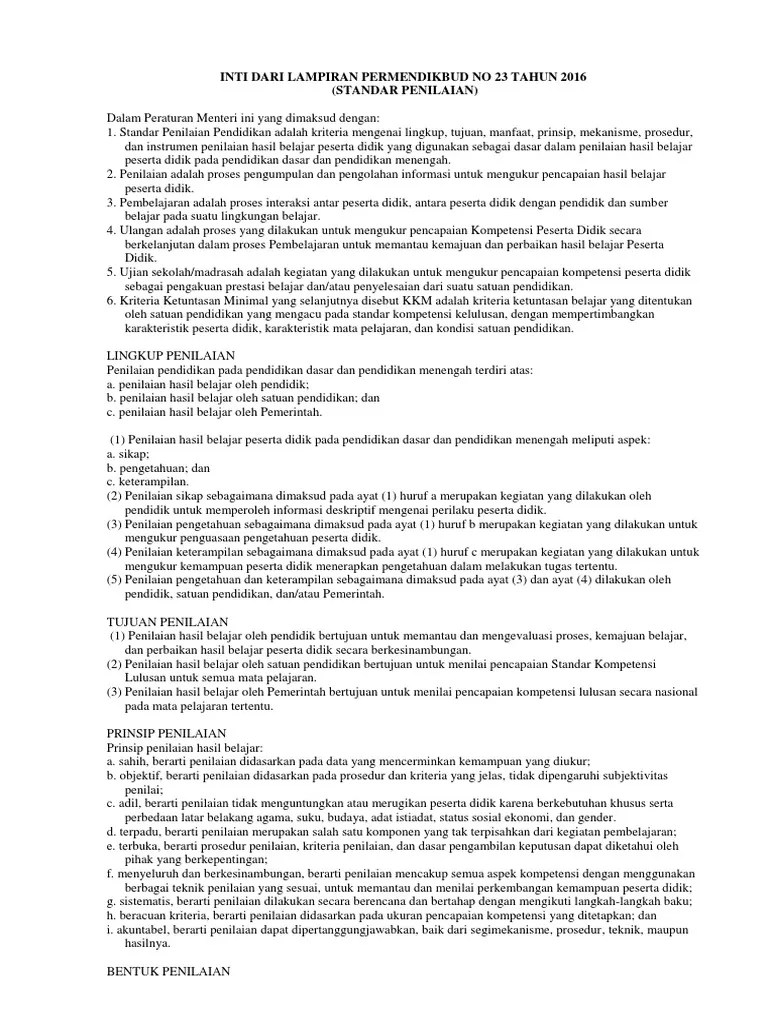 Pdf permendikbud no 23 thn 2016 standar penilaian pendidikan . Inti dari lampiran permendikbud no 23 tahun 2016 (standar penilaian) dalam peraturan menteri ini yang dimaksud dengan: Telah disebutkan dalam permendikbud 23 tahun 2016,. Permendikbud nomor 23 tahun 2016 yaitu penilaian hasil. Berikut ini beberapa hal penting terkait standar penilaian yang diamanatkan oleh peraturan menteri pendidikan dan kebudayaan (permendikbud) nomor 23 tahun 2016 .